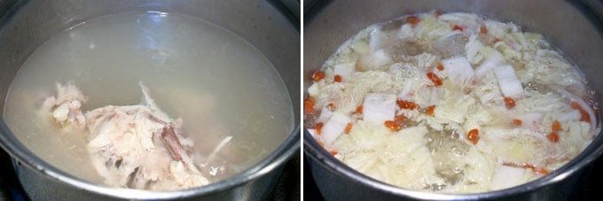 Remove chicken carcasses with a slotted spoon. Add Napa cabbage and goji berries. Simmer for another 10 minutes until Napa cabbage is very soft. Turn off heat and transfer broth to an electric fondue pot or deep skillet until about half full. Do not over fill as food will be added to the broth at the table.